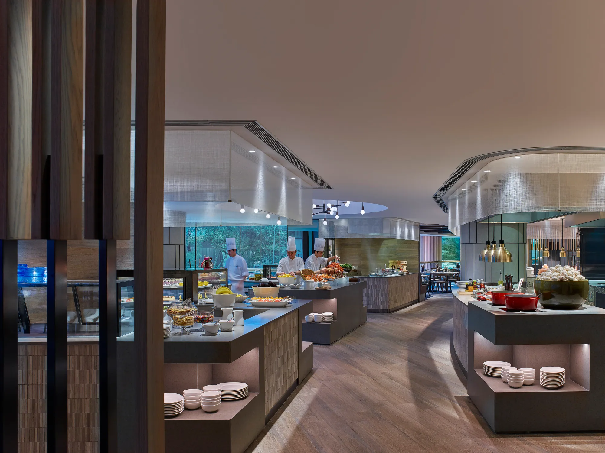 카페 이스트의 시장 스타일 ‘네이버후드’에서 아침, 점심, 저녁 뷔페 및 일품요리를 즐겨보세요. 오픈 키친과 다양한 조리 공간에서 풍겨 나오는 유혹적인 향이 식욕을 자극하며, 신선한 재료를 강조한 서양 및 아시아 요리를 제공합니다. 해산물, 사시미와 스시, 로스팅 및 찜 요리를 포함한 다양한 코너를 자유롭게 둘러볼 수 있으며, 웍, 철판구이, 면 요리, 디저트를 포함한 라이브 쿠킹 스테이션에서 현장 조리된 요리를 즐길 수 있습니다.